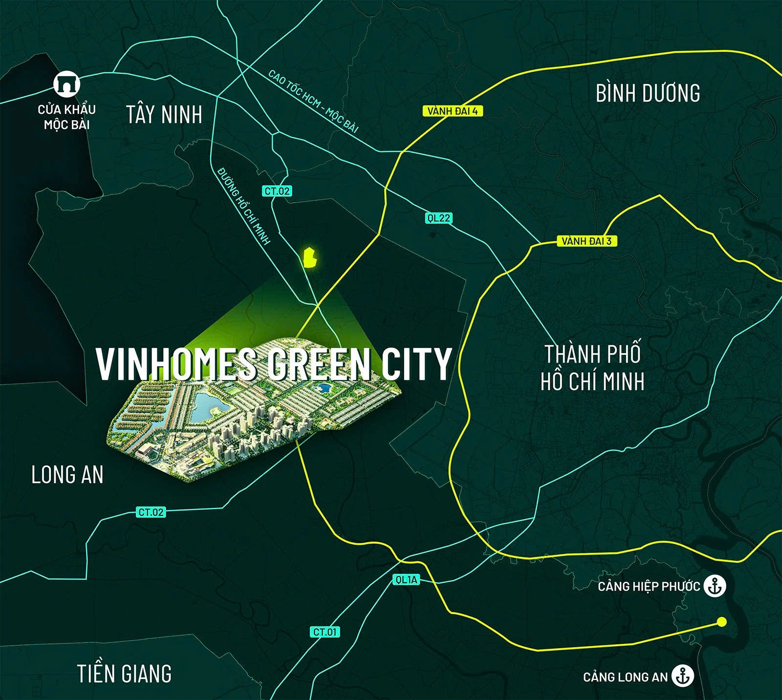 Đây được xem là vị trí trung tâm của vùng công nghiệp phía Tây TP HCM, hưởng trọn dòng chảy thương mại từ hai cụm cảng Hiệp Phước & Long An, cửa khẩu quốc tế Mộc Bài – Tây Ninh, và các cảng lớn phía Đông TP HCM khi hạ tầng hoàn thiện.