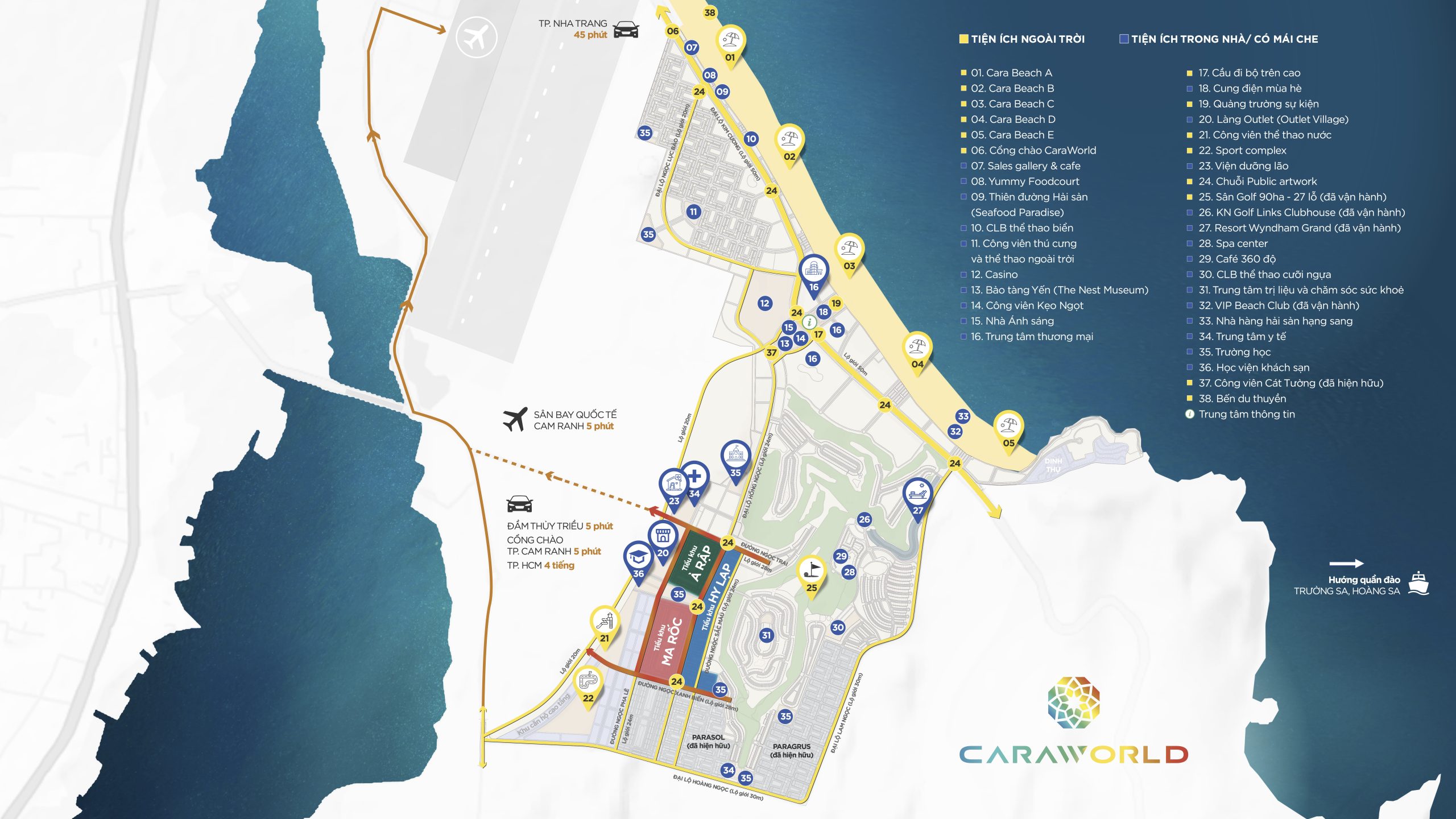 CaraWorld nằm ngay trên bờ biển Cam Ranh, Khánh Hòa, chỉ cách trung tâm thành phố Nha Trang khoảng 20 km và sân bay quốc tế Cam Ranh chỉ 10 km. Từ dự án, cư dân có thể dễ dàng tiếp cận các điểm tham quan nổi tiếng như Vinpearl Land, biển Nha Trang, và nhiều khu vui chơi giải trí khác. Lợi thế về vị trí này giúp CaraWorld không chỉ là một nơi nghỉ dưỡng mà còn là một điểm đến hấp dẫn cho du khách trong và ngoài nước. Với sự kết nối thuận lợi qua các tuyến đường lớn, cư dân có thể dễ dàng di chuyển đến các khu vực lân cận chỉ trong vòng 30 phút, tận hưởng vẻ đẹp của biển cả và sự nhộn nhịp của thành phố Nha Trang.
