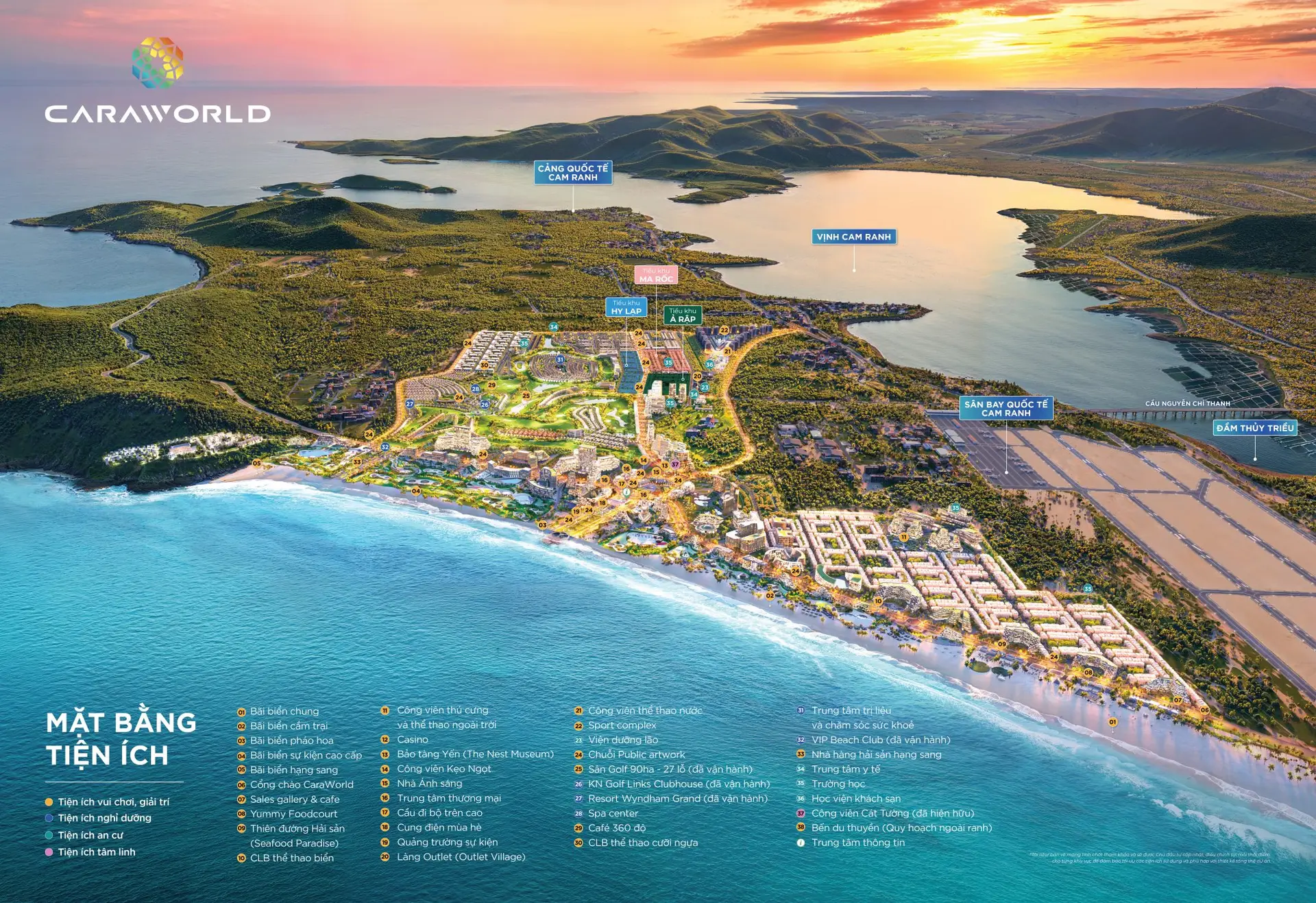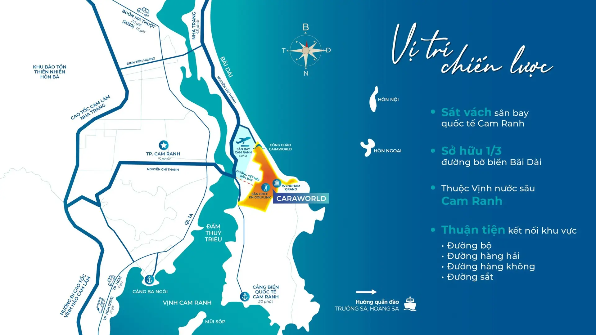 Cara World nằm ngay trên bờ biển Cam Ranh, Khánh Hòa, chỉ cách trung tâm thành phố Nha Trang khoảng 20 km và sân bay quốc tế Cam Ranh chỉ 10 km. Từ dự án, cư dân có thể dễ dàng tiếp cận các điểm tham quan nổi tiếng như Vinpearl Land, biển Nha Trang, và nhiều khu vui chơi giải trí khác. Lợi thế về vị trí này giúp CaraWorld không chỉ là một nơi nghỉ dưỡng mà còn là một điểm đến hấp dẫn cho du khách trong và ngoài nước. Với sự kết nối thuận lợi qua các tuyến đường lớn, cư dân có thể dễ dàng di chuyển đến các khu vực lân cận chỉ trong vòng 30 phút, tận hưởng vẻ đẹp của biển cả và sự nhộn nhịp của thành phố Nha Trang.